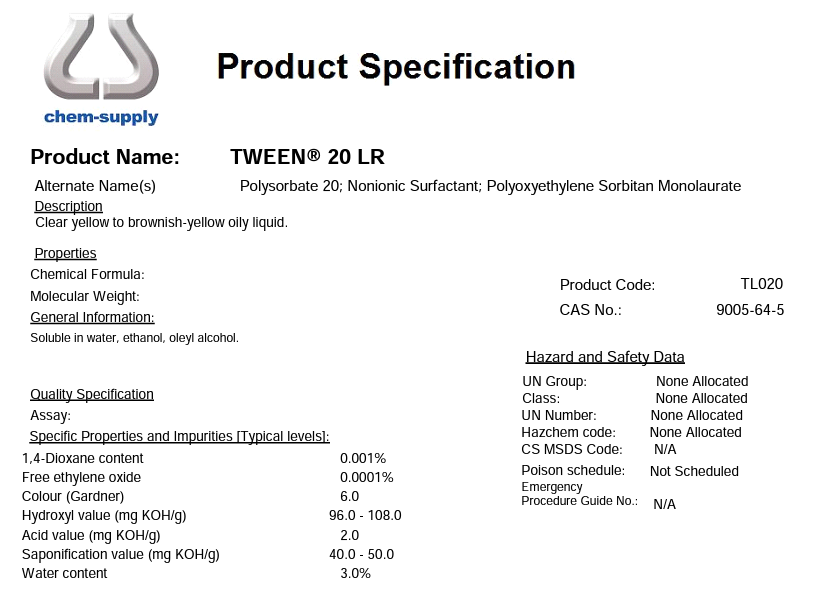 Chem-Supply™ (Australia) Tween 20, Lab 500ml