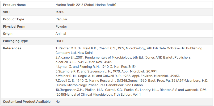 Marine Broth 2216 (Zobell Marine Broth) is recommended for cultivation and enumeration of heterotrophic marine bacteria. High amount of salt content is used to simulate seawater. Other minerals are used to mimic the mineral composition of seawater.