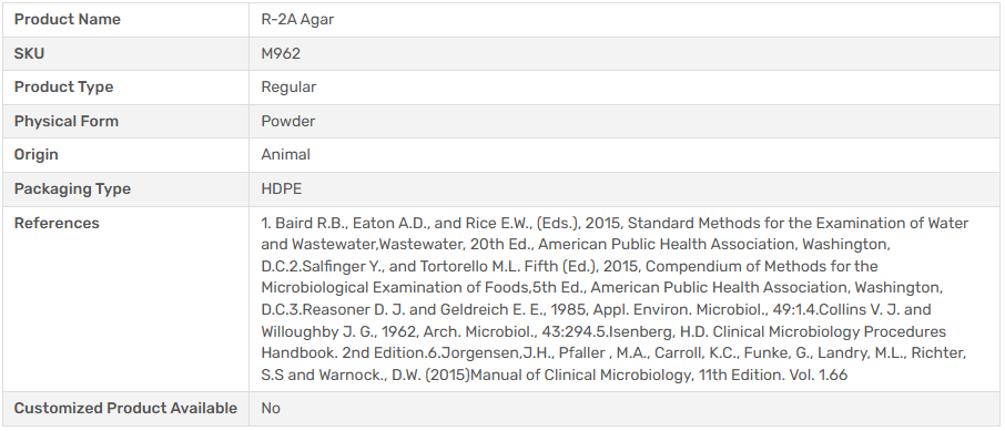 Recommended by APHA for estimating the heterotrophic plate count by the pour plate, spread plate or membrane filter procedure. R-2A Agar incubated for longer incubation periods allows stressed organisms to grow well.
